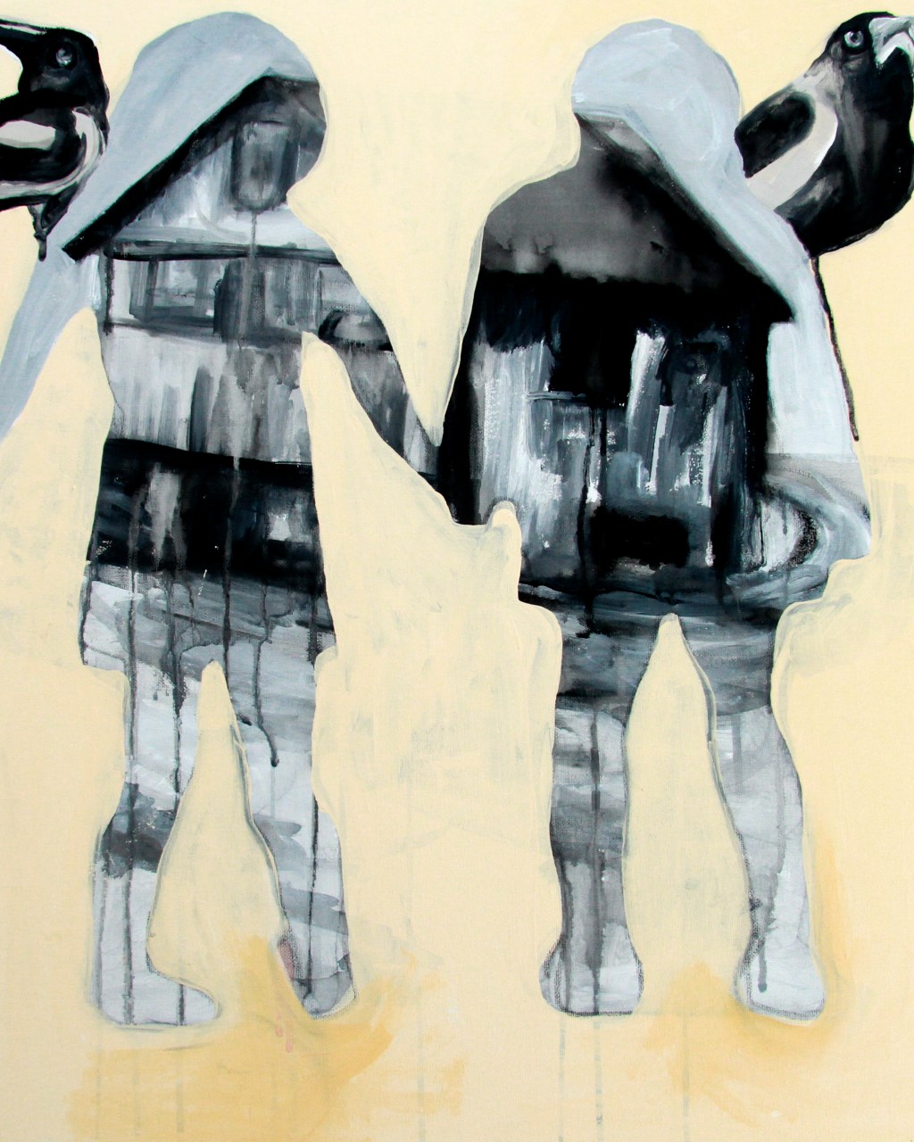 Method Sketchbook studies gathering observations of place. Collages constructed from aspirational living imagery — cut, repasted, painted over — making visible the conflict between the natural world and modern domestic life. Painting happened in a spare room and during craft sessions run by church groups with crèches. Children and magpies appeared repeatedly because they were everywhere — in my life and in the landscape.