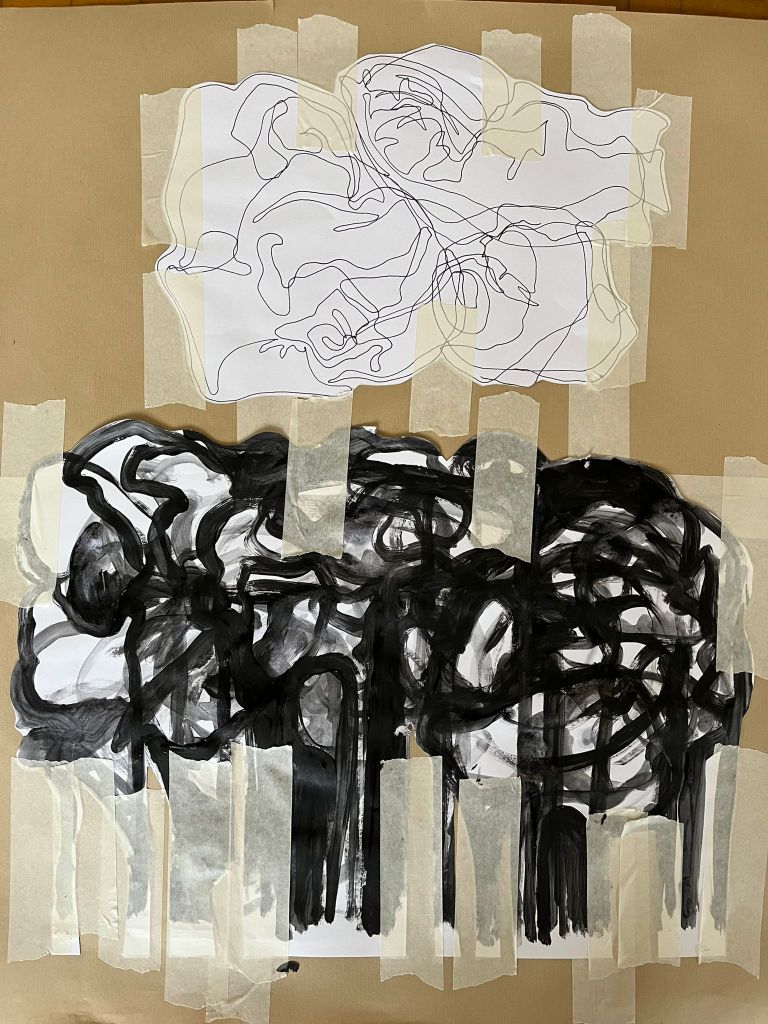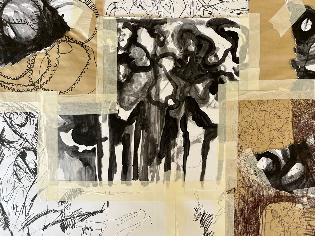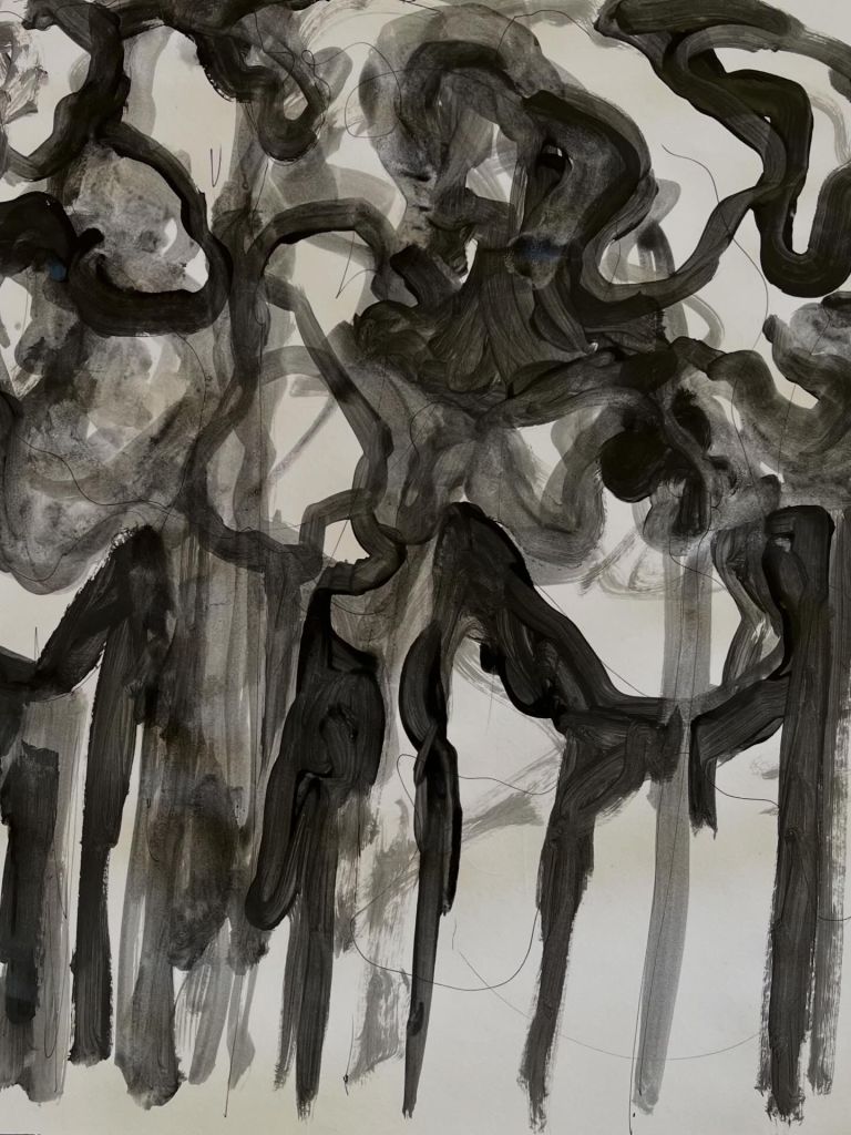 The second strand, Worlding Studies, is a practice of automatic drawing and painting made in collaboration with materials, my internal world, and my ongoing reading of new materialist and post-human theory. These works develop in dialogue with the thinking of Karen Barad, Donna Haraway and Jane Bennett — the understanding that matter is active, relational and entangled with the humans who work alongside it.