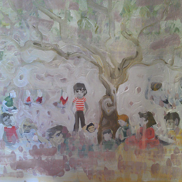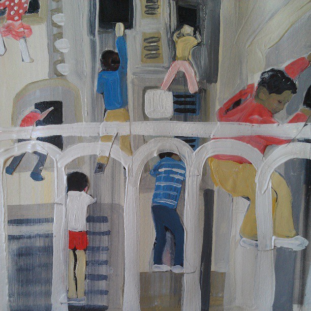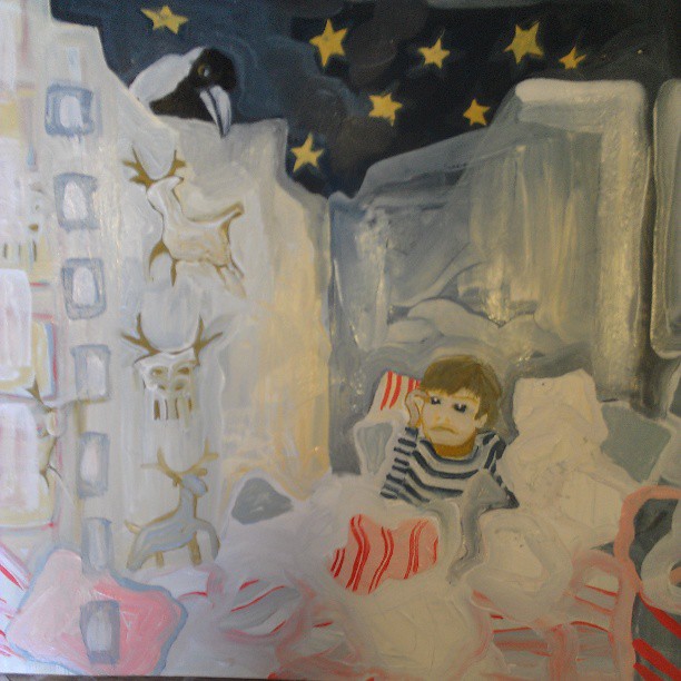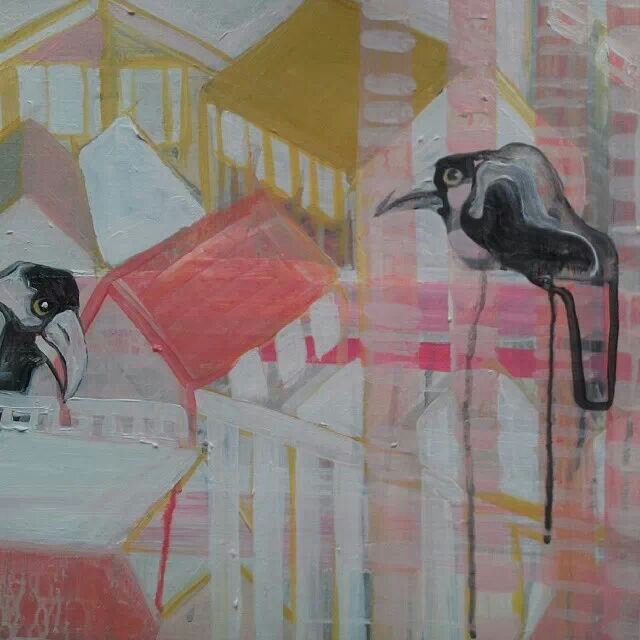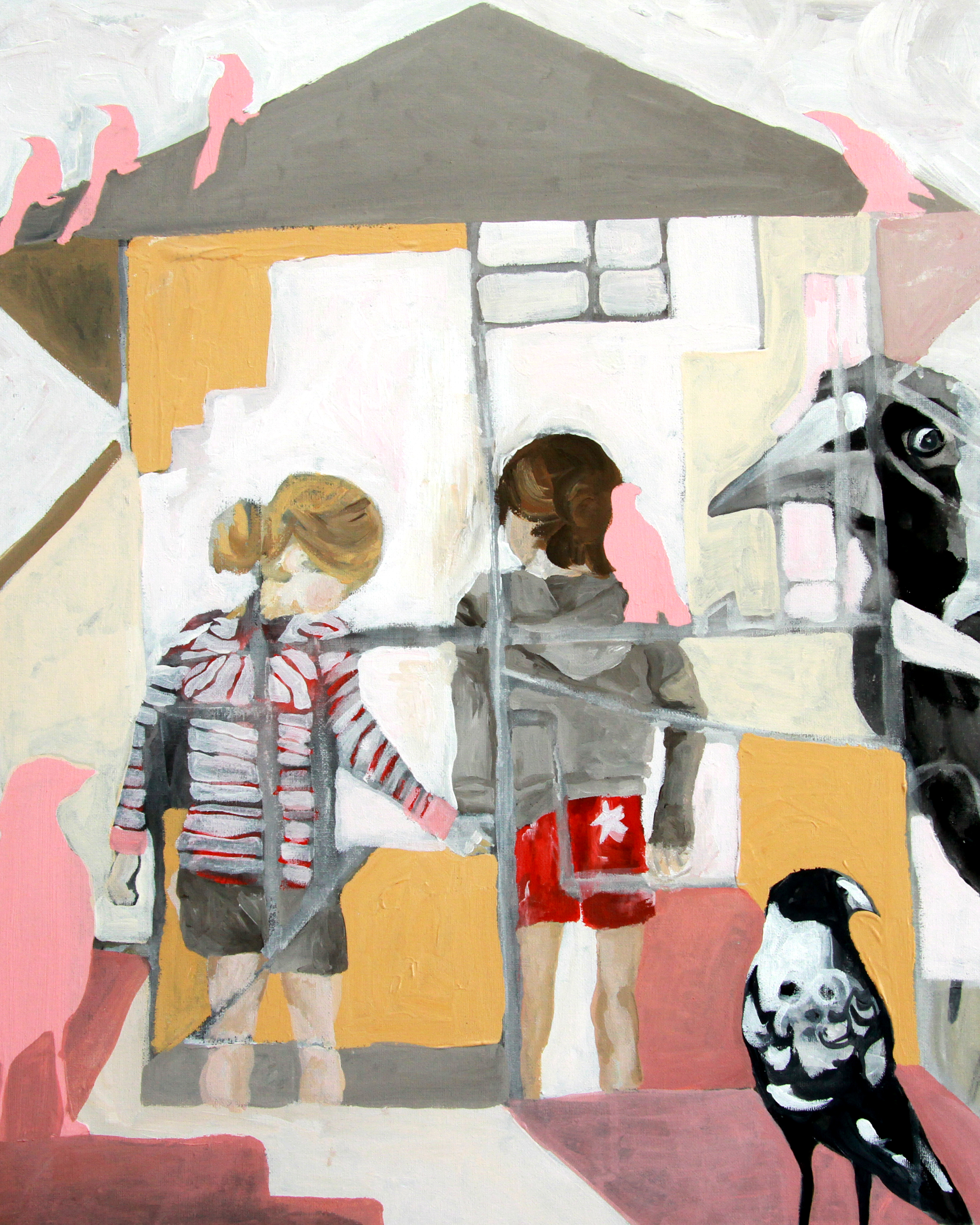 This body of work began during a period of relocation to Western Australia, where I explored feelings of disconnection and reorientation through painting. Drawing on time spent with my children in urban playgrounds, on scorched earth and under the gaze of magpies, I developed a visual storyworld in which birds guide children away from urban spaces and into imagined, untamed landscapes.
